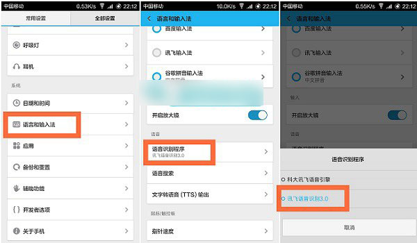 一、首先进入小米3 设置-> 语言和输入法 -> 语音识别程序-> 然后选择讯飞语音识别3.0,如下图所示: