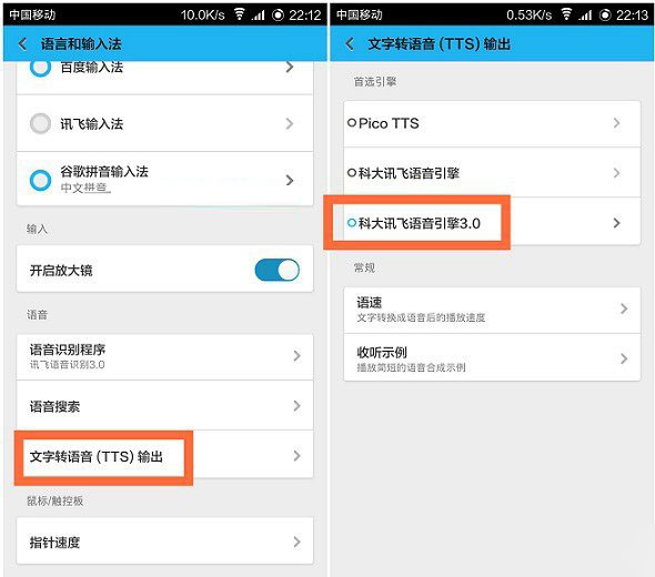 二、然后在 文字转语音(TTS)输出 -> 选择科大讯飞语音引擎3.0(这个默认为pico TTS(安卓语音包,支持英语、西班牙语等),如果选择pico TTS,需下载相应语音包),如下图所示: