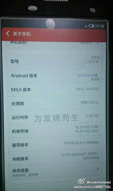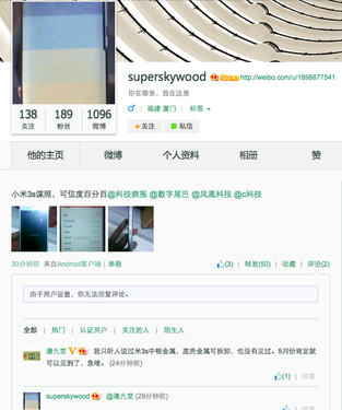 该谍照是一名名为superskywood的网友在微博上曝光,该网友称图中的手机就是即将发布的小米3S,并且强调可信度百分之百。同时业内分析师潘九堂回复该网友道听说小米3S中框采用金属材质,这也进一步证明了谍照的真实性。