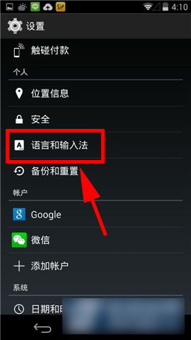 1)进入手机“设置”,下拉菜单找到并点击“语言和输入法”。(如下图)