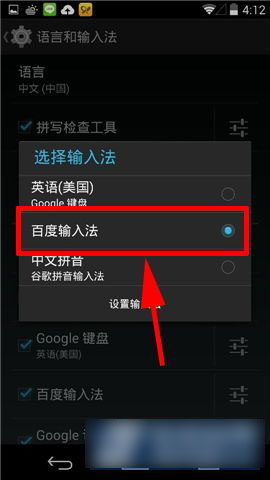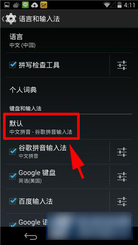 2)在“语言和输入法”页面找到“默认”,点击就可以选择需要设置成默认的输入法了。(如下图)