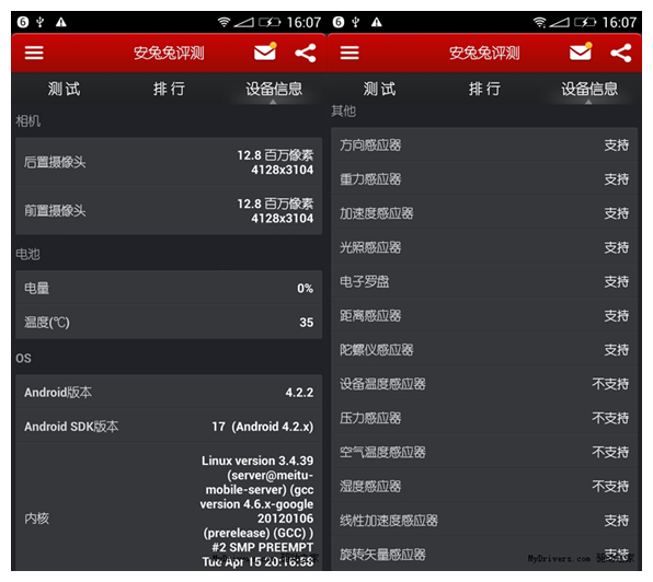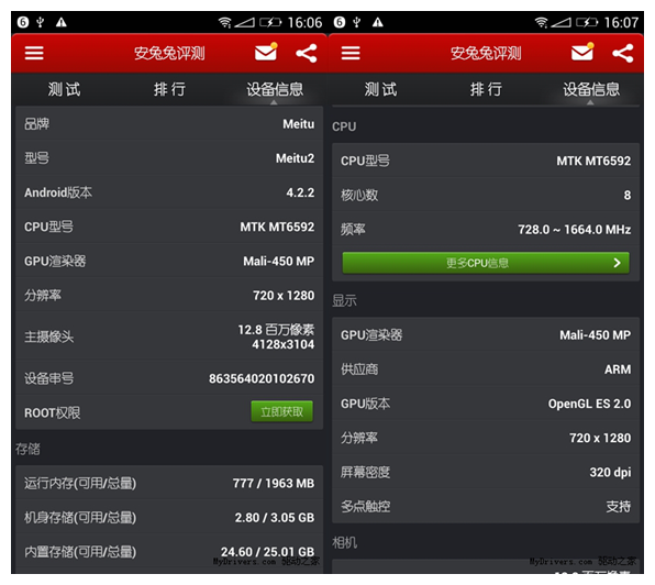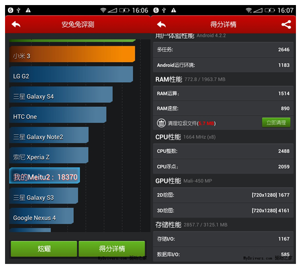 从以上美图手机2安兔兔测试看:美图手机2安兔兔跑分成绩是18370分,这个成绩超过了三星 Galaxy S3和谷歌Nexus4,我们也可以得知美图手机2采用主频1.7GHz的MTK 6592八核处理器,相比美图手机1S主频1.5GHz的MTK6589T四核处理器提升不少。整体看来,美图手机2这个分数也是情理之中的事情,性比价虽然不是一个特色,但是对于喜欢自拍的妹纸来说,我们就知道了这个价格的合理性!