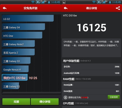 从上面HTC Desire 816安兔兔数据分析,HTC Desire 816安兔兔跑分16125分,对于一个四核的手机来说,HTC Desire 816整体性能还是比较高的,整体配置属于时下中端水准。