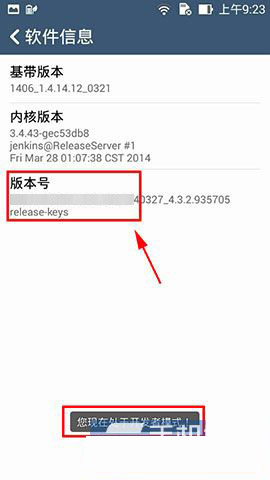 2)然后点击进入“软件信息”在版本号上连续点击几下,直到出现“你已处于开发者模式”。(如下图所示)