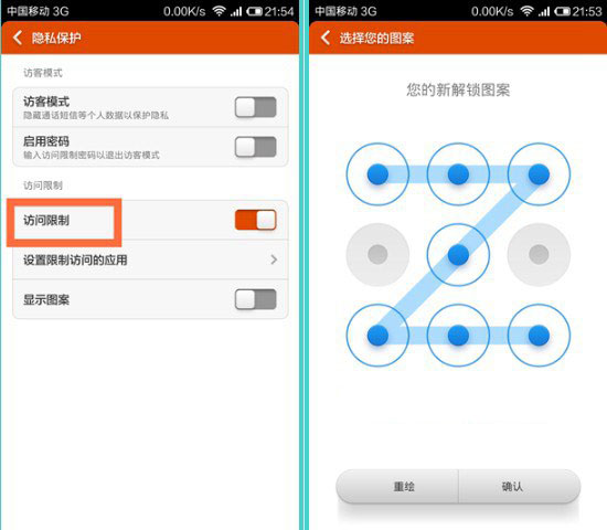 二、在小米3隐私保护设置中,我们开启“访问限制”功能,然后再设置需要图形密码(此图形密码就是后面设置加密应用或者程序的密码,需要设置成自己熟悉的),如下图所示。