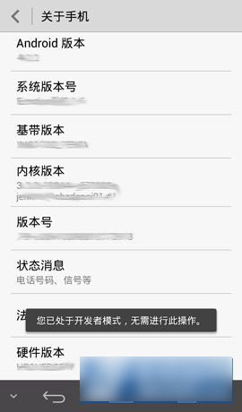2)在“关于手机”页面连续点击版本号,直到显示“你已处于开发者模式,无需进行此操作”为止。(如下图所示)