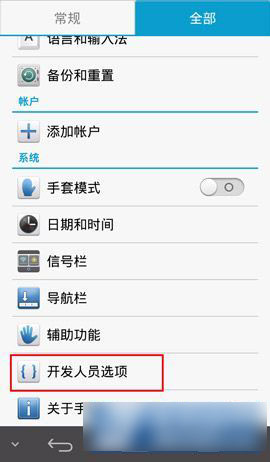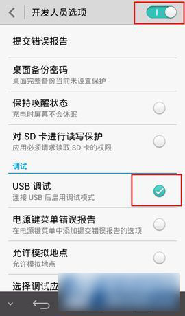 3)然后再返回“设置”,可以看见“开发人员选项”,打开“开发人员选项”,然后再把“USB调试”的开关勾选上,这样就打开华为Ascend P7的USB调试了。(如下图所示)