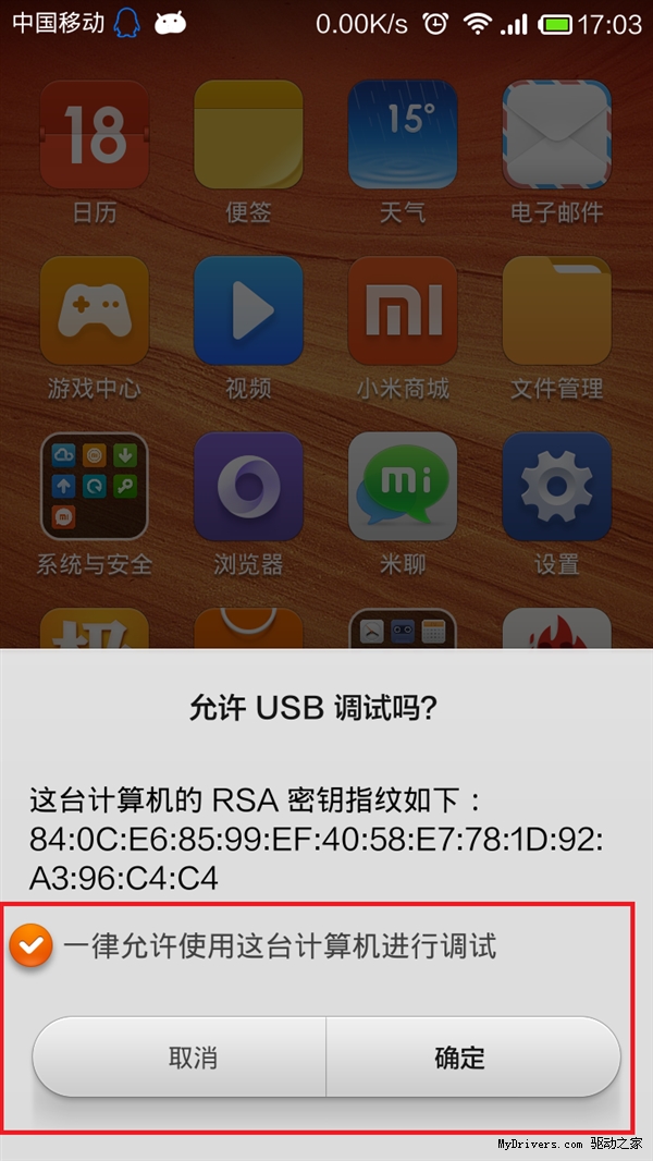 驱动安装完成之后手机端会弹出允许USB调试模式的提示,选择同意即可。