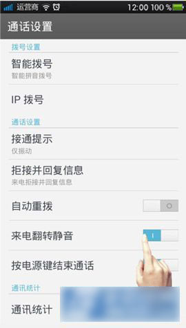 2)OPPO Find 7快速静音方法二:打开Find 7的【设置】,点击【通话设置】,然后把【来电翻转静音】选项打开,这样在来电的时候只需翻转手机也可以静音了。(如下图)