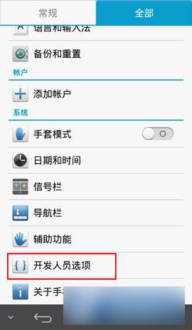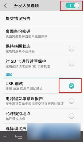 3)然后再返回“设置”,可以看见“开发人员选项”,打开“开发人员选项”,然后再把“USB调试”的开关勾选上,这样就打开华为Ascend P7的USB调试了。(如下图所示)