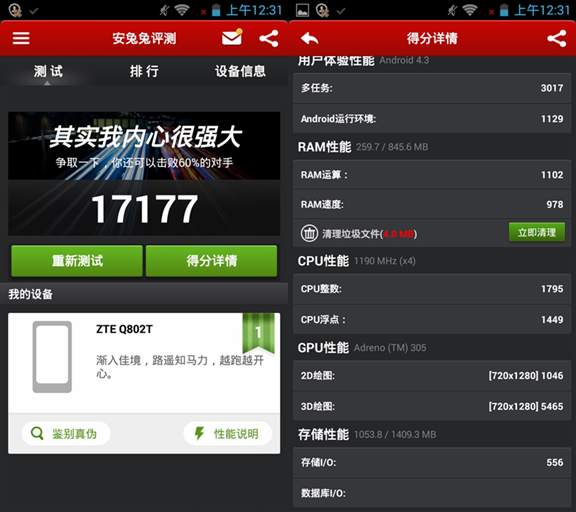 从安兔兔测试成绩看,中兴大Q安兔兔跑分17177分,中兴大Q作为入门机型在性能方面已经足够,能较好的提供日常的使用需求。同时,得益于720P分辨率,Adreno 305渲染起来也不太吃力,基本的流畅度还是能保证的,NenaMark 2得分在入门4G手机中是相对比较高的。