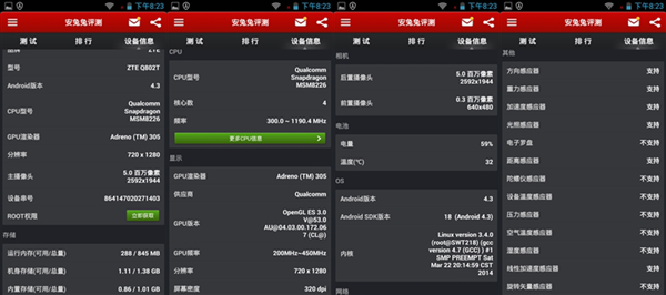 从上图我们可以看出:中兴Q802T搭载了高通MSM8926四核处理器,主频1.2GHz,搭配1GB内存,作为入门机也还可以。而内置的4GB机身存储就有些捉襟见肘了,还好该机支持32GB机身扩展,日常放几部电影看看是完全没有问题的。