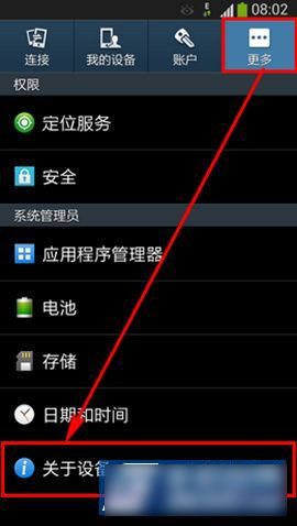 1)打开三星S4的手机【设定】,选择【更多】栏的【关于设备】。(如下图)