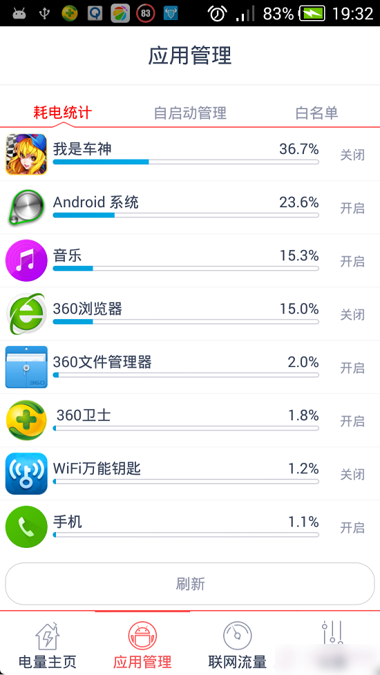 五、进入底部第二大项“应用管理”里面第一页是一些应用耗电量的统计 。