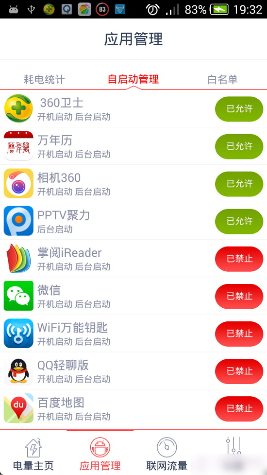 其中“应用管理”第二页是自启应用的管理,你可以选择允许或都禁止它。