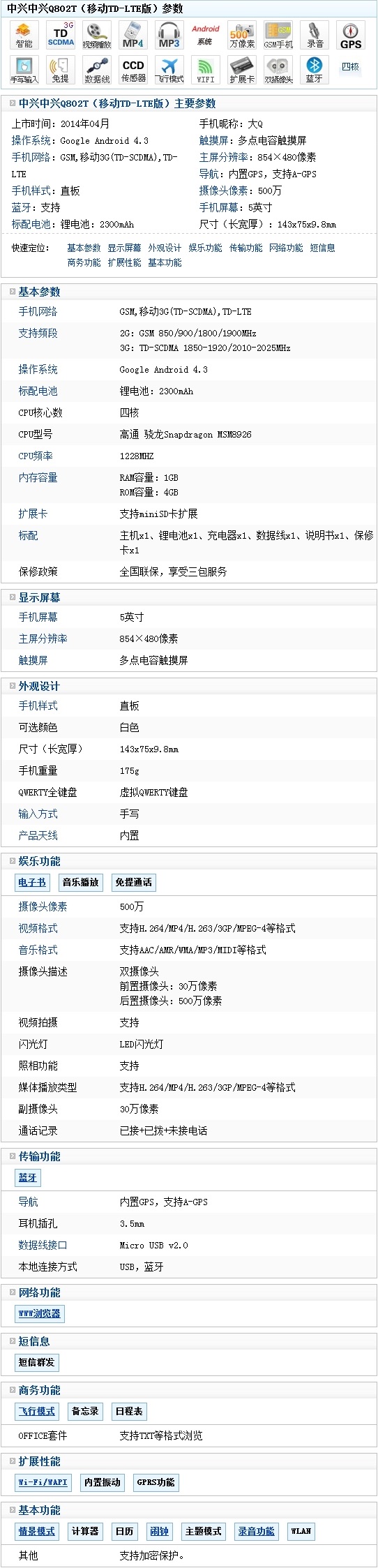 中兴Q802T搭载主频为1.2GHz的高通 骁龙Snapdragon MSM8926四核处理器,采用5英寸的多点电容触摸屏,该屏幕分辨率为854x480像素,配置1GB的RAM内存+4GB的ROM内存,前置30万像素+后置500万像素的摄像头,运行Android OS 4.3的操作系统。