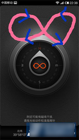 3)按照图中的动作,拿着手机在空着比划一下,就是做8字画圈,消除干扰并校对方向,这样就可以校准指南针了!(如下图所示)