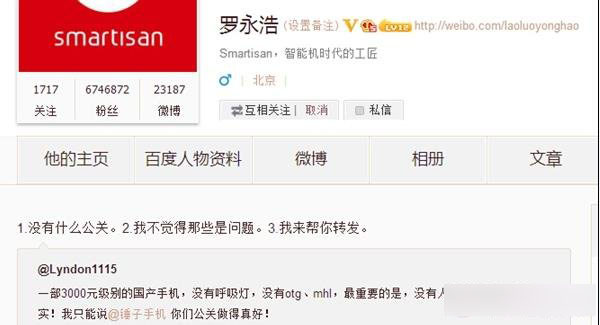微博有人吐槽锤子手机,3000块居然不支持OTG、MHL以及呼吸灯功能,并且反问锤子手机的公关做得太好额