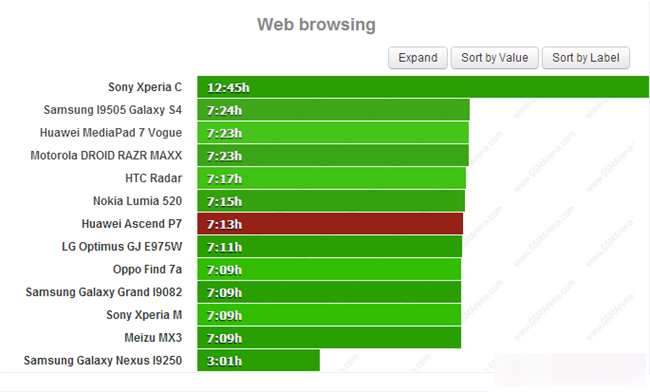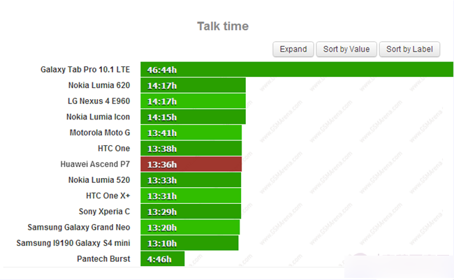 通话时间方面,华为P7的表现和HTC上代旗舰产品HTC One的表现类似,在3G网络下能够坚持13小时36分钟,这个结果并不算好,距离现如今的旗舰产品表现相去甚远。