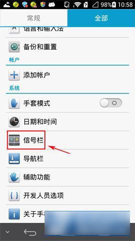 1)首先打开华为P7的【设置】,进入设置界面,点击【信号栏】按键。(如下图所示)