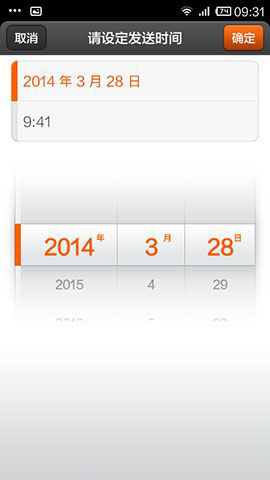 3)点击进入“定时”的按钮,然后调节发送短信的时间,最后发送即可,系统会根据设定的时间给好友发送短信。(如下图所示)