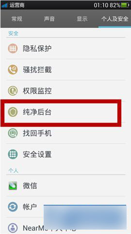 点击OPPO Find7手机的“设置”,然后再点击“个人及安全”的“纯净后台”,在这里,你可以选择冻结某些应用,这样就再也不用担心流量被偷偷用完了。(如下图所示)