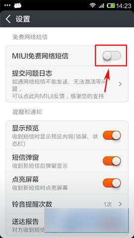 2)然后在显示出的界面中按【设置】按键,最后在设置界面,打开【MIUI免费网络短信】选项即可。(如下图所示)