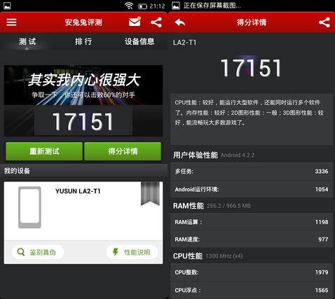 从上面红辣椒青春版安兔兔跑分得知:红辣椒青春版安兔兔跑分成绩为17151分,这样的分数与目前市面上的千元四核机型保持在同一个水平线上,能够保证系统的流畅运行,程序的响应速度和日常应用的多任务处理都是说得过去的,这样的配置对于基层用户、学生、老人来说足够用了。