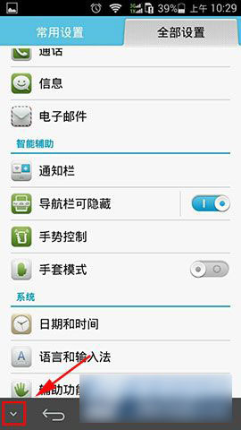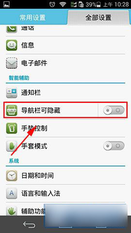 2)在“全部设置”中往下拉,然后就可以看到“导航栏可隐藏”这一按钮,然后点击开启,就可以在导航栏的“v”中点击一下,就可以隐藏导航栏了。