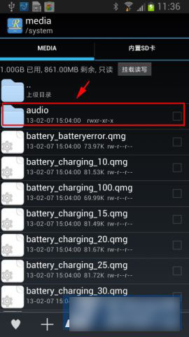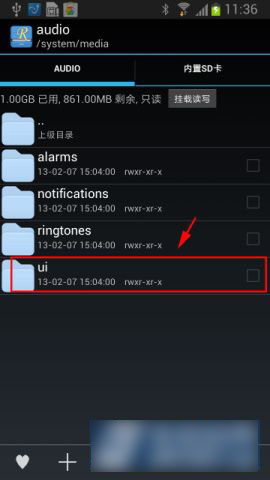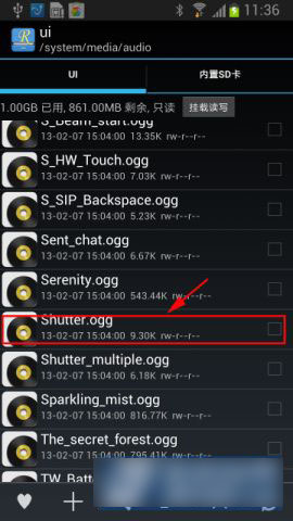 3)在“audio”界面点击“ui”,在“ui”界面点击“shutter.ogg”。(如下图所示)
