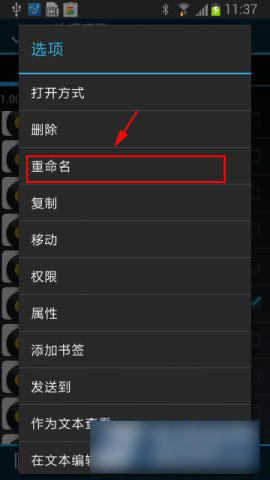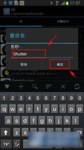 4)在点击“shutter.ogg”后弹出的对话框点击“重命名”,随后在“重命名”修改框里将“.ogg”后缀去掉就行了。这样note3的相机声音也就关闭了。(如下图所示)