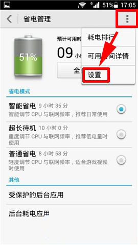 2)点击右上角【...】,在弹出菜单选择【设置】,然后把【高耗电提醒】选项关闭。(如下图)