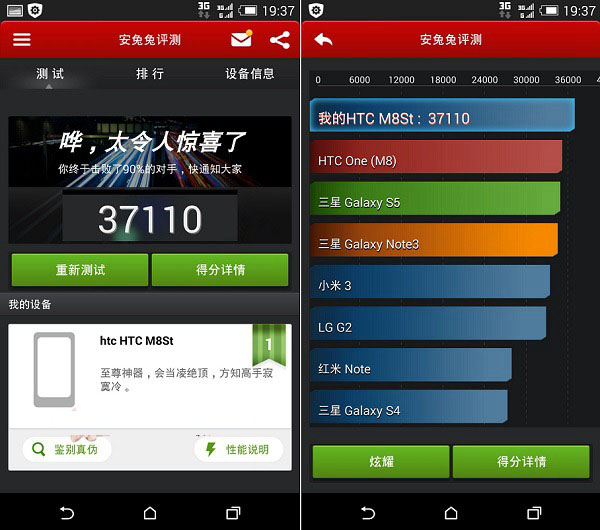 通过HTC One时尚版安兔兔跑分测试可以看出,这款手机的安兔兔跑分成绩达到了37110分,也就是超过了3.7万分,属于时下顶尖级旗舰机性能水平。