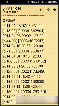 而按屏幕左下角的复制图标(像书页标志那个),可以将交易记录信息复制到剪切板中。如果你喜欢可以黏贴到便签,短信,微信等中去。下面以黏贴到便签为例: