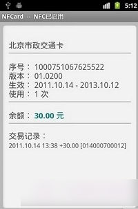 程序提示“没有卡片信息。请将卡片靠近手机后盖上的NFC天线进行读卡”。按照此提示将两张公交卡依次靠近米3“屁股”。听到提示音后,即可看见屏幕上显示如下信息: