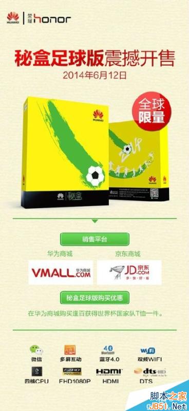 此次限量供应的秘盒足球版在华为商城和京东都可以购买哦!让人惊喜的是秘盒足球版加量不加价,保持488元的售价不变,限量发售,售完为止,而且在华为商城购买逢百再送世界杯T恤一件!大家还在等什么,赶快来抢购吧!有什么比看世界杯还要重要的事情呢!!!