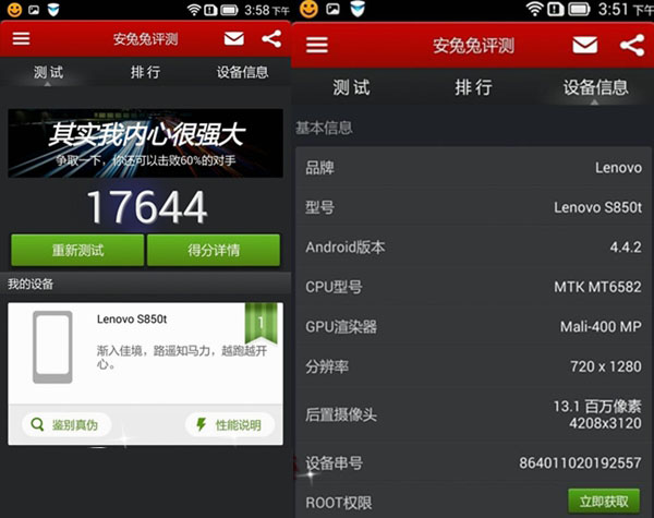从安兔兔测试得知:联想S850安兔兔得分17644分,我们知道联想S850是针对女性的手机,但是这样的跑分丝毫不逊于其它同样配置的手机,跑分结果还是不错的。