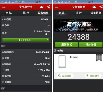 从安兔兔跑分成绩来看,大Q Note跑分成绩为24388分,可以看出大Q Note的真八核的诱惑力要比骁龙低端产品来的足,另外真八核的性能也是有保证的,24388分的跑分成绩便能看出端倪。