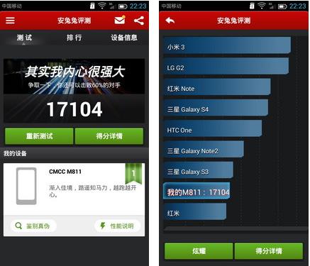 在安兔兔评测基准性能跑分测试中,中国移动M811的总分为17104分。该成绩略高于千元级四核产品红米,同时与当年的四核旗舰机型三星GALAXY S3基本持平,如上图所示,“CPU性能”一般,“3D图形性能”则非常好,与它的内在配置相符