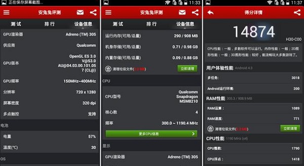 从安兔兔跑分的测试成绩来看,荣耀3C电信版的安兔兔跑分成绩为14874分,表现只能说是一般。