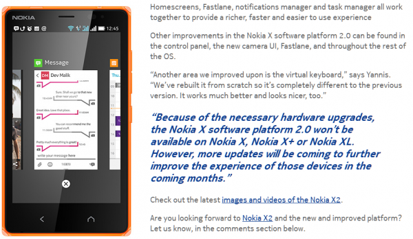 Nokia X2无论在硬件和软件方面都有非常大的提升,但对于那些已经购买Nokia X的用户来说下面这则消息注定不会让他们开心,在诺基亚官方博客中说明写到Nokia X并不能通过升级来享受Nokia X2系统的新特性和相关功能。