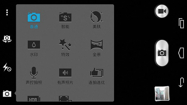 华为荣耀6内置了一枚1300万像素后置摄像头,采用最新索尼IMX214感光元件,F/2.0大光圈,支持4K拍摄,具备水印相机、熄屏快拍、全焦模式、自动对焦、全景拍照、声控拍照、数码变焦等特性。荣耀6的拍照界面在风格上跟原生系统有些类似,而操作方式则保留了点按的模式,如下图所示。