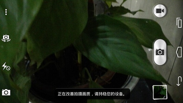 值得一提的是,当光线特别弱的情况下,荣耀6拍摄界面会提示“正在改善画质,请持稳您的设备”,此模式下荣耀6会进行降低快门速度,以提高进光量,从而增强低光下的拍照效果,不过实际效果并不明显,这也是目前智能机在过于弱光下,拍摄照片普遍不佳的通病。