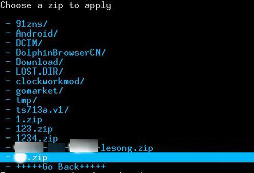 3)接下来就是开始刷入zip格式的刷机包了,按音量键选择install zip from sdcard确认,然后再按音量键选择choose zip from sdcard,然后确认,接下来按音量键移动光标找到之前放入SD卡根目录的刷机包,然后选择Yes – Install XXXXX.p-确认开始刷机。