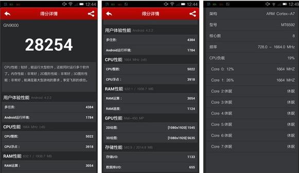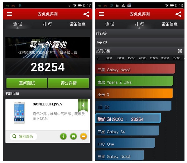 从安兔兔测试结果来看,金立ELIFE S5.5蓝色版最终安兔兔跑分成绩为28254分,从排行榜看,金立ELIFE S5.5蓝色版得分在LG G2其下,在三星S4,HTC one其上,而从价格方面和外观考虑,金立ELIFE S5.5蓝色版更具有性价比。