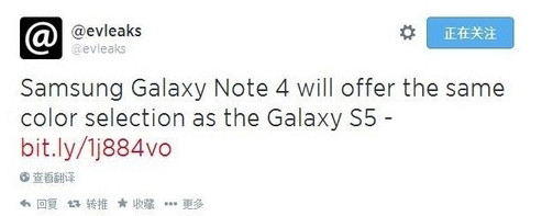 三星Galaxy S5目前有黑色、白色、金色与蓝色四种颜色款式。如果Note 4采用与S5相同的颜色,那么三星旗舰手机的设计策略便更加统一化了。有媒体推测Note 4与S5的相同配色或许是考虑到利用相同生产线来降低成本这一因素。