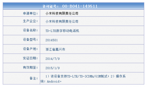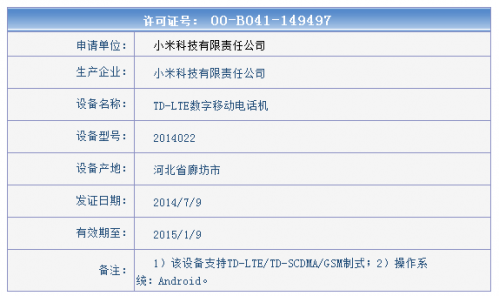 遗憾的是工信部现在还没有公布小米这两款新机的具体图片,但从生产厂商我们不难看出前者是红米系列,后则则是小米系列。综合此前的消息,2014215则应该是4G版红米Note,而2014022则是小米手机4。二者支持的网络制式均为TD-LTE/TD-SCDMA/GSM,并没有WCDMA和LTE FDD,应该是移动版三模产品,不出意外的话未来会有联通4G和电信4G版诞生,但首发均为移动版。