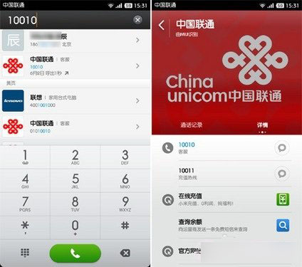 如上图所示,当我们在拨号键盘中键入“10010”后,MIUI系统便会自动识别出这是运营商的客服号码。此时,点击通话栏中靠右的剪头便能够来到这个号码的详情页面。显而易见,这里除了查看通话记录外,我们可以进行的操作还有很多,例如致电客服或充值热线、访问官方网站、快速查询余额与在线充值等。