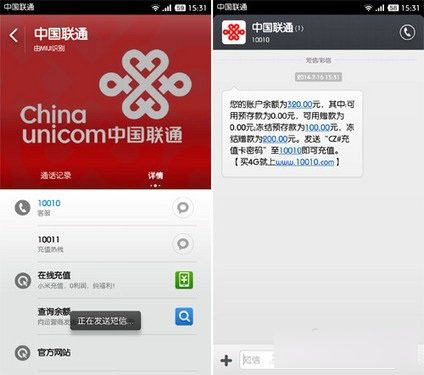 值得一提的是,当你点击查询余额时,系统便会自动想客服中心发送一条免费短信,1分钟内,用户能够收到运营商发来的话费余额信息了,这比致电客服要快捷得多。与此同时,神奇的功能就在于,在这个页面下,我们就可以通过“在线充值”的方式为手机充值话费了。