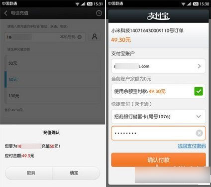 操作方法很简单,点击“在线充值”之后,来到面额选取的页面,此时上方信息栏中的电话号码便是你本机的号码,当然我们也可以在这里键入其他号码来进行充值。这里的充值面额共有30元、50元以及100元等3种。需要说明的是,这里所有的充值业务,完全是由小米商城代理的,所以可信度毋庸置疑,同时还有一定的优惠力度给用户。